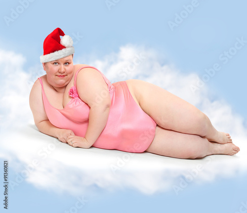 Obese Woman With Santa S Cap Flying On Cloud In Heaven Funny Theme For Christmas Greeting Cards Stock Photo Adobe Stock